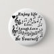 Ein Knopf mit Herz und Musiknoten und Redewendungen, um andere zu ermuntern, das Leben zu genießen, zu leben, zu lachen und Liebe jeden Tag und sich selbst zu sein. Feiern Sie jeden Tag Ihres Lebens.