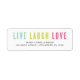 Farbenfroh "Live, lachen, Liebe" in einem kühnen Schriftart mit Namen und Anschrift unten
