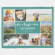 Foto Collage Fleece Decke gedruckt mit acht Ihrer Fotos gerahmt durch einen aquamarinen und weißen Rand. Die Liebe zum Live-Lachen wird in einem Kalligrafieschrift geschrieben, einem Herz, das die Wörter trennt. Fügen Sie Ihren Familiennamen in einem charmanten handgeschriebenen Schriftart hinzu.
