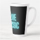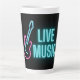 In der Tasse "Live Music" steht ein Neontext aus Aqua mit einer rosa und aqua gitarren Kontur auf schwarzem Hintergrund.