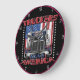 Diese patriotische Wanduhr ehrt die entscheidende Rolle der LkwLkw in den Vereinigten Staaten in starkem Maße. Vor einem schwarzen Hintergrund, der von einem kräftigen rosa Rand gerahmt ist, zeichnet sich ein kühner Halbwagen im Cartoon-Stil aus, der direkt nach vorne gerichtet ist, Set vor dem Hintergrund der amerikanischen Flagge mit senkrechten rot-weißen Streifen. Hinter der LKW-Kabine ist ein blaues Feld mit weißen Sternen zu sehen. Die roten Wörter "TRUCKERS" sind oben gekrümmt, und "MOVE AMERICA" wird in einem passenden roten Schriftart am unteren Rand angezeigt, flankiert von weißen Sternensäulen. Es ist ein perfektes Geschenk, die Hingabe der amerikanischen LKW-Fahrer zu feiern. Das Designwerkzeug kann auch zum Hinzufügen von benutzerdefinierten Texten verwendet werden, wenn Sie Ihren Namen oder Ihre Firma auf dieser Uhr gewollt haben. Sie können die Farbe des Rahmens an jede gewünschte Farbe anpassen, indem Sie in das Designwerkzeug gehen.