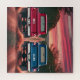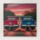 LKWs der 1960er fahren gemeinsam eine rote Schotterstraße durch das Land hinunter und treiben Schmutz mit einem rosa HimmelsSonnenuntergang in der Ferne. Der links LKW ist rot, die rechte ist königsblau. Fügen Sie mit unserer Vorlage individuelle Name zu den Zielgeräten hinzu!