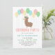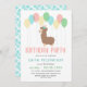 Eine Kindergeburtstag-Party Einladung mit einem flauschigen braunen Lama mit einer blauen Blume, stehend unter hübschen Ballons in Rosa, Blau, Grün und Gelb.