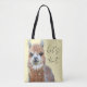 Knitting tote bag with llama image. The llama is rusty tan and white and chews on some grass. "Let's Knit" text is a template over a light yellow checkered background that wraps around to the other side. This bag is lined and would be perfect for hauling a knitting project.