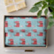 Gewebepapier mit einem illustrierten Muster von Lamas in Santa Anzugs und Hüte auf blauem Hintergrund.