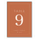 This elegant table card design features a minimalist and modern aesthetic, perfect for a sophisticated wedding celebration. The warm terracotta background is complemented by clean, white typography that exudes simplicity and grace. The large, prominent number "9" draws attention while maintaining an understated charm. Ideal for adding a touch of refined elegance to your special day, this design ensures each table setting feels coordinated and stylish. Customize with personal details to create a cohesive look across all your event stationery.