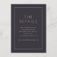 Diese elegante Hochzeitseinschlusskarte verfügt über ein anspruchsvolles und minimalistisches Design, das perfekt ist, um wesentliche Details mit Eleganz zu vermitteln. Die saubere Typografie und das einfache Layout schaffen eine Atmosphäre unterschwelliger Eleganz, während die dunkle Farbpalette einen Hauch von Formalität und Raffinesse hinzufügt. Ideal für Paare, die einen modernen und dennoch zeitlosen Look suchen, stellt diese Karte sicher, dass Ihre Gäste alle benötigten Informationen in einem stilvollen Format haben, das jedes Hochzeitsthema ergänzt.
