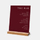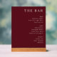 This elegant wedding menu design exudes sophistication with its rich maroon background and clean, modern typography. The layout is simple yet refined, featuring a clear categorization of beverages such as beer, wine, and spirits, perfect for guiding guests through their dining experience. The mood is classic and inviting, ideal for an upscale celebration where attention to detail enhances the overall ambiance. Its minimalist style ensures it complements any sophisticated decor while maintaining focus on the essential information, making it a versatile choice for various wedding themes.