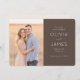 This elegant wedding save the date design features a warm, romantic photo set against a soft, earthy backdrop. The layout combines a tender moment captured in the photograph with sophisticated typography on a rich brown panel, creating an inviting and timeless feel. Perfect for couples looking to announce their special day with grace and charm, this design exudes warmth and love, setting the tone for a memorable celebration. Customizable text areas allow you to personalize your message while maintaining the overall aesthetic appeal.