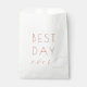Dieses elegante Design für eine Hochzeitstüte strahlt einen zeitlosen und anspruchsvollen Charme mit seinem minimalistischen Stil aus. Der Text "Best Day Ever" wird in einer einladenden Mischung aus Großbuchstaben und kursiver Typografie präsentiert, was einen Hauch von Romantik und Feierlichkeit hinzufügt. Vor einem sanften weißen Hintergrund mit zarten goldenen Akzenten unterstreicht die Farbpalette das allgemeine Gefühl von Freude und Raffinesse. Perfekt für die Erinnerung an besondere Momente, fängt dieses Design die Essenz von Liebe und Glück ein und macht es ideal für Hochzeiten oder andere unvergessliche Ereignisse. Seine sauberen Linien und subtile Eleganz sorgen dafür, dass es zu jeder Dekoration passt und bei den Gästen einen bleibenden Eindruck hinterlässt.