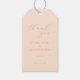 Dieses elegante Geschenkanhängekarte für die Hochzeit hat einen weichen, rosafarbenen Hintergrund mit zarter goldener Typografie, die Eleganz und Wärme ausstrahlt. Das Design ist minimalistisch und dennoch charmant und perfekt, um sich bei Ihren Gästen an Ihrem besonderen Tag zu bedanken. Mit seinem einfachen Layout und seiner eleganten Schrift erfasst es die zeitlose Eleganz einer romantischen Feier. Ideal, um Ihren Hochzeitsgeschenken eine klassische Note zu verleihen, ergänzt diese Karte jedes klassische oder moderne Hochzeitsthema.