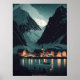 Die Lofoten-Inseln liegen im norwegischen Polarkreis, wo Fjorde, Fjorde und Berge sich zu einer atemberaubenden Naturlandschaft überschneiden. Dieses Poster präsentiert ein schönes Bild der Lofoten Inseln in einem digitalen Kunststil. Die Berge sind mit weißem Schnee bedeckt, und an der Küste gibt es eine Reihe von Häusern mit besonderen und schönen Formen. Die Reflexionen der Häuser und Lichter am Wasser sind sehr schön in der dunklen Nacht. Am Himmel schwimmen leichte Schneeflocken. Im Vordergrund stehen einige Silhouetten von Touristen, die sich amüsieren. Diese Schönheit.