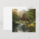 A serene blank notecard with a wilderness nature theme. The illustration is an a-frame log cabin out in the mountains and woods with a deer next to a rippling stream.