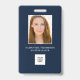 Navy Foto Identification Abzeichen mit Firmenlogo. Ersetzen Sie das Foto durch Ihr eigenes und ändern Sie den Text. Einfach das Firmenlogo hinzufügen. Modernes, einfaches Abzeichen der Mitarbeiter.