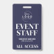 Your Logo Navy Blue White All Access Event Staff Badge. Great for fashion shows, concerts, large special events like conferences, concerts, lectures, and even birthday parties or any occasion where you want to make your guests feel special. This badge features a simple, modern, yet elegant design with a navy blue background and a spot at the top to add your company name or logo.