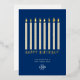 Wünschen Sie Ihren besten Kunden, Mitarbeitern und Geschäftspartnern einen glücklichen Geburtstag mit dieser eleganten, modernen und einfachen minimalistischen Business Corporate Happday Card, mit hohen neutralen beige Farbkerzen mit echter Goldfolie gepresste Flammen und goldene Folie glücklicher Geburtstagstext unter ihnen, auf einem benutzerdefinierten marineblauen Hintergrund, der in jede andere Farbe geändert werden kann, um Ihrem Geschäftsplan zu entsprechen. Auf der Vorderseite befindet sich auch ein eigener Text und ein Platz für Ihr individuelles Logo. Ideal für alle Arten von Unternehmen. Die Goldfolie kann auf Silber oder Rose umgestellt werden.