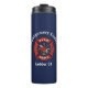Stilvolles Design für Feuerwehrleute, Feuerwehrmänner und ihre Familien, mit dem Logo der roten, generischen Feuerwehr auf dunkelblauem Hintergrund. Kundenspezifische Angaben zur Stadt oder zum Landkreis oder Name des Feuerwehrmanns im modernen weißen Schriftart