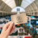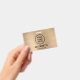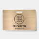 Modernes Namensschild mit dem Logo Ihres Unternehmens oder Ihrer Organisation vor einem goldfarbenen Imitat mit metallischem Hintergrund. Fügen Sie einen Namen und Titel in einfacher Typografie hinzu.