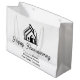 Diese professionelle Geschenktasche für Immobilienmakler ist individuell gefertigt mit dem Namen Ihrer Immobilienfirma unter der modernen kursiven Schrift für ein Open House. Diese trendigen minimalistischen weißen und schwarzen Werbegeschenktaschen für Immobilienfirmen zeigen ein Haus-Logo-Bild für den Hausbau oder die Marketingabteilung einer Immobilienagentur.