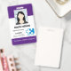 Erstellen Sie Ihre eigenen personalisierten Mitarbeiternamensmarken und Abzeichen mit einer modernen vertikalen Vorlage, die leicht Ihr eigenes Foto, Firmenlogo, Bar Code und andere wichtige Informationen hinzufügen kann. Ein einfaches Business-Design in lila und weiß & Name und Titel mit Bar-Code. Keine Mindestbestellung.