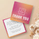 Elegante Dankeschön für Ihren Kauf oder bestellen quadratische Mini-Einsteckkarte mit individueller Logo-Vorlage auf einem fuchsienrosa und gelb orange Farbverlauf Hintergrund. Mit dem Designwerkzeug können Sie Schriftart und Farben ändern.