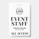 Ihr Logo Weißer Hintergrund Schwarz Schriftart Alle Zugang Event-Mitarbeiter Abzeichen. Ideal für Modenschauen, Konzerte, Konferenzen, Vorträge oder jede besondere Veranstaltung, bei der Sie gewollt haben, um den Gästen das Gefühl zu geben, sich zu fühlen - inklusive Geburtstagspartys. Dieses Abzeichen zeichnet sich durch ein gepflegtes und modernes Design mit weißem Hintergrund und schwarzen Schriftart aus. Oben gibt es einen Platz, um Ihren Firmennamen oder Ihr Firmenlogo hinzuzufügen. Unten wird "Veranstaltungspersonal" in einem fett formatierten Serif-Schriftart dargestellt, gepaart mit einfacher Typografie für den Veranstaltungsnamen, das Datum und den "All Access Pass". Vollständig anpassbar, können Sie Text, Schriftart und Farben an Ihre Bedürfnisse anpassen.