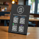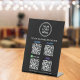 Einfaches schwarzes Tischschild für Ihr Geschäft mit Venmo-, Paypal-, CashApp- und Zelle QR-Codes für Kunden, um mobile elektronische Zahlungen zu prüfen. Fügen Sie Ihr Logo, QR-Codes und Firmennamen, Telefonnummer und Website in einfacher weißer Schrift hinzu.