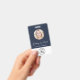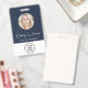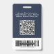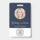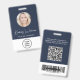 Modernes berufliches, blaues ID-Abzeichen mit dem Foto Ihres Mitarbeiters in einem Kreis-Rahmen, seinem Namen in einem schicken weißen Drehbuch und seinem Titel in schlichter weißer Schrift und Ihrem Firmenlogo. Fügen Sie auf der Rückseite zusätzliche Informationen und optionale QR- und Bar-Codes hinzu.
