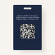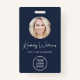 Berufliches blaues ID-Abzeichen mit dem Foto Ihres Mitarbeiters in einem Kreis-Rahmen, seinem Namen in einem schicken, weißen Schriftsatz, seinem Titel in reiner weißer Schrift und dem Logo Ihres Unternehmens oder Unternehmens. Fügen Sie auf der Rückseite zusätzliche Informationen und einen optionalen QR-Code hinzu.