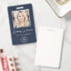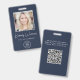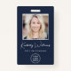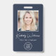 Berufliches blaues ID-Abzeichen mit dem Foto Ihres Mitarbeiters, seinem Namen in einem schicken, weißen Drehbuch und seinem Titel in weißer Schrift und dem Logo Ihres Unternehmens oder Unternehmens. Fügen Sie auf der Rückseite zusätzliche Informationen und optionalen QR-Code hinzu.