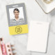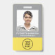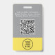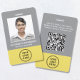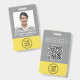 Modernes und berufliches Abzeichen für graue und gelbe Mitarbeiternamen mit Foto, Name und Position sowie dem Firmenlogo. Fügen Sie auf der Rückseite zusätzliche Informationen und optionalen QR-Code hinzu.