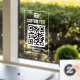 Weiße und klare Fensterklammern mit Ihrem Logo, QR-Code und benutzerdefinierten Text. Ideal für Ihr Unternehmen, um Kunden suchen nach mehr Informationen, Angebote, Online-Menü, zu bezahlen etc. lassen.