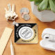Doppelseitiger Schlüsselanhänger mit eigenem Logo auf weißem, rundem Hintergrund, umgeben von kreisförmigem Text auf der Vorderseite und QR-Code auf der Rückseite. Schwarzer und goldener Farbverlauf (Druckbild) Hintergrund. Ändern Sie die Schriftart- und Schriftart-Farben, verschieben und verändern Sie Elemente mit dem Entwurfstool.
