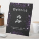 Stilvoller schwarzer Hintergrund, weißer Text. Dekoriert mit lila Imitaten Glitzer Staub. Mit dem Text: Willkommen. Personalisieren und fügen Sie Ihr Firmenlogo und Ihren Text hinzu.