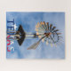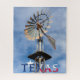 Ein grafisches Bild von Texas Pride, mit einer ikonischen Windpumpe, oder Windmühle, wie sie in vielen Ranch-Ländern zu sehen sind, und die rot-weiß-blaue Fahne über dem Namen des Staat. All dies über einen blauen Himmel mit weichen weißen Wolken.