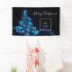 Ein trendiger und moderner Weihnachtsbanner für Ihr Unternehmen, in Schwarz, Blau und Weiß. Ein schwarzer Hintergrund mit einem glänzend blauen Weihnachtsbaum, der mit Sternen geschmückt ist. Mit dem Text: Frohe Weihnachten geschrieben mit modernen und trendigen großen weißen Handschrift Schreibschrift im Stil. Vorlagen für Ihr Unternehmen, Firmenlogo.
