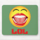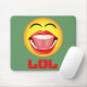 Lächelndes Gesicht © Sonnige Mars Designs. Diese coole, humorvolle, lustige Maus-Pad oder Maus-Matte zeigt eine lustige Abbildung eines gelben lachenden Gesichtsgesichts-Emotizons mit einem offenen großen Mund, leuchtend weißen Perlenzähnen, Zunge und geschlossenen Augen, mit dem Akronym "LOL" darunter steht für Laughing Out Loud. Konzept für den Spaß.