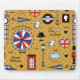 Whimsical Muster zeigt große bunte Doodles von Big Ben, Palastwächter, Teebecher und andere Darstellungen des Londoner Lebens