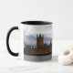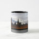 Eine Tasse mit einem Foto der Häuser des Parlaments am Sonnenuntergang.