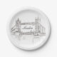 Sieben Zoll Papier Teller mit Stift und Tinte Illustration der Londoner Tower Bridge. Das ist ein ausgeklügeltes Schwarz-Weiß-Design, das von der Künstlerin Leah Wiedemer entworfen wurde. Ideal für ein Ausgehen Party oder einfach nur Ihre Lieblings-Anglophile.