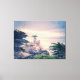 Ein einziger Monterey Cypress-Baum steht stolz auf einer felsigen Klippe über einem weiten Ozean am Pebble Beach, Kalifornien. Der Himmel ist eine weiche Mischung aus Rosa und Blau, was auf einen ruhigen Sonnenaufgang hindeutet. Das Bild wird aus einer leicht erhöhten Perspektive aufgenommen und zeigt die raue Schönheit der Küste. Im Vordergrund stehen üppige Vegetation und strukturierte Felsen, die der Szene Tiefe und Dimension verleihen.