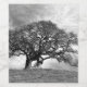 Ein Schwarz-Weiß-Foto eines beeindruckenden Eichenbaumes mit Platz für Text, um Ihr Label zu personalisieren.