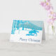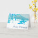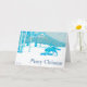 Ein Wolf (Canis lupus) durchquert in diesem stilisierten, blauen Monoton-Bild eine schneebedeckte Landschaft mit Birkenbäumen und Bergen. Text lesen, "Frohe Weihnachten" erscheint auch. Fügen Sie Ihren eigenen zusätzlichen Text hinzu.
