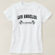 Frauenweißer T - Shirt, um zu zeigen, dass Sie stolz sind, aus Los Angeles zu sein. Dieses T - Shirt-Design zeigt "Los Angeles" in einem Schriftart vom Plattentyp mit "California" und "Golden Staat" in stilvollen Schriftart mit Palmen auf beiden Seiten.