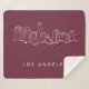 Dieses Ausrüstungsbeschreibungen eine Hand gezeichnete Illustration des Los Angelesskyline auf einem magentaroten Hintergrund.