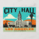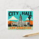 Eine mutige Vintage Illustration des ikonischen Rathauses von Los Angeles in Kalifornien. Die beeindruckenden Farben Türkis, Orange und Creme unterstreichen die historische Architektur des Gebäude, die von Palmen und Bergen gerahmt ist.