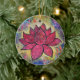 Dieses farbenfrohe Ornament besticht durch eine exquisite Lotusblüte in einer lebhaften magentafarbenen Farbe, die von Lindy Gaskill entworfen wurde. Buddhistische Symbolik sagt, der Lotus sei symbolisch für die Reinheit des Körpers, der Sprache und des Geistes. Die Blume ist im Schlamm verwurzelt, und sie wächst durch das schlammige Wasser heran, um auf den ruhigen Gewässern zu schwimmen und zu blühen, oberhalb davon, dass sie sich über der Bindung und dem Verlangen erhebt.
