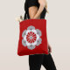 Japanische mandala-bedruckte Tasche, die eine stilisierte Lotus-Blume darstellt, symbolisiert Reinheit, spirituelles Erwachen und Treue - Blume in silbergrau / grau, rot und weiß, auf dunkelchinesischem, rotem Hintergrund