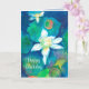 A pretty happy birthday greeting card featuring a lotus flower with opening petals with delicate pastel colors of blue, green and yellow with large turquoise green leaves and accented with colorful pods. Lovely card for someone special on their birthday! You can customize the text to fit your needs.