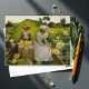 Postkarte inspiriert von Charles Curran Lotus Lilies Kunstwerk, zeigt zwei Frauen in einem Boot mit einem Regenschirm, umgeben von pulsierenden Lotuslilien.